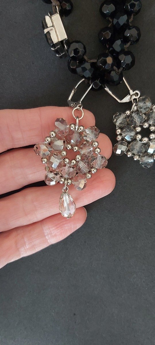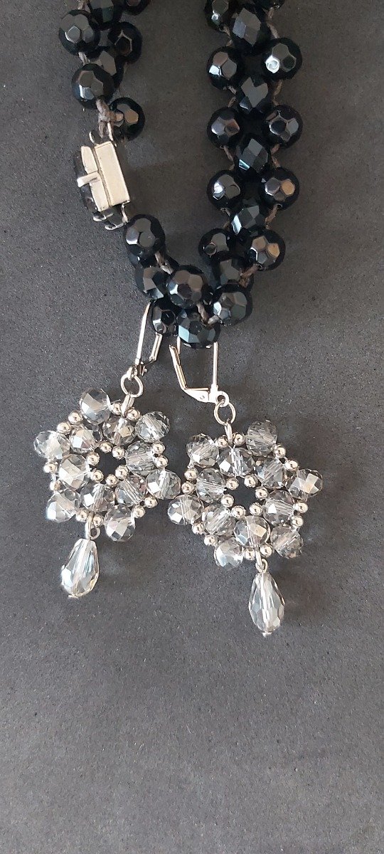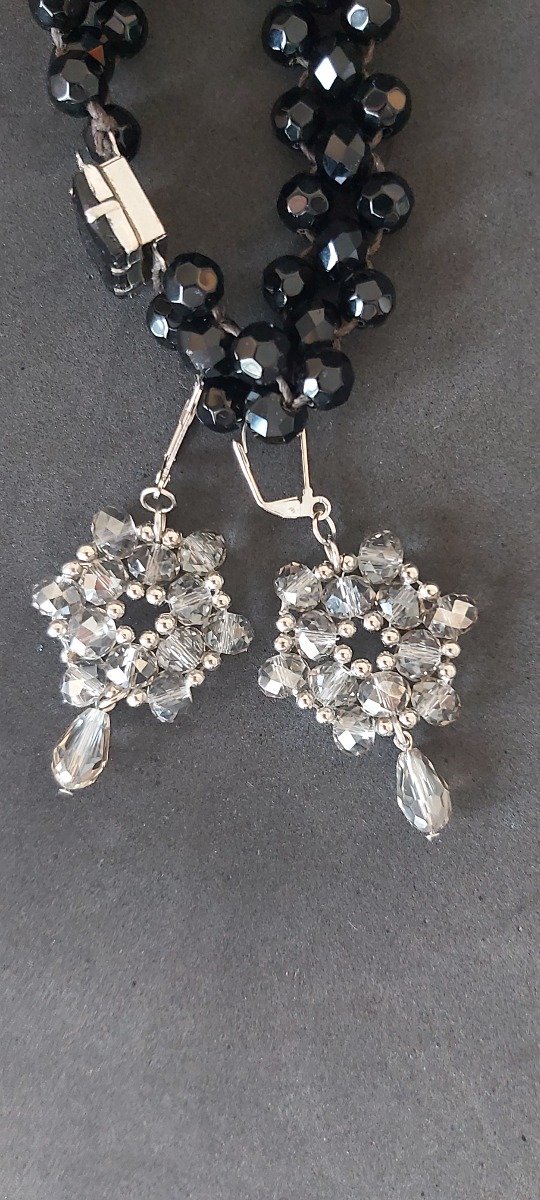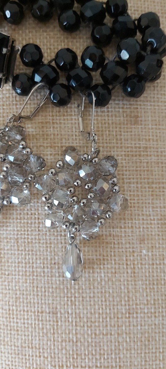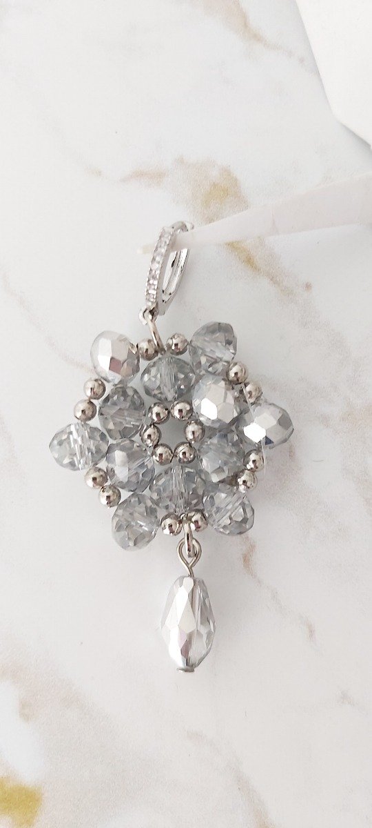 Aros de cristal color gris y bolitas de metal hechos a mano.