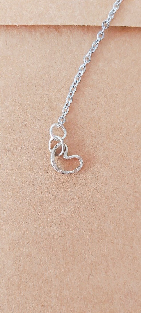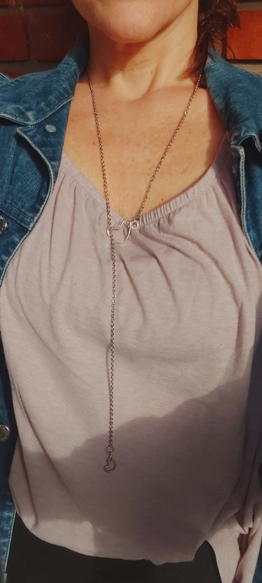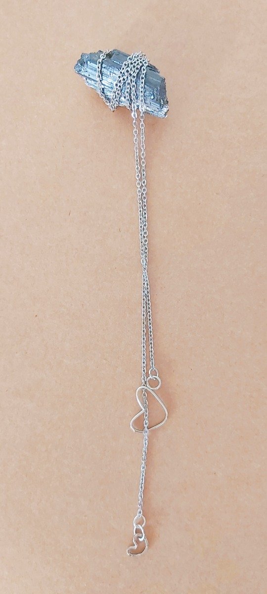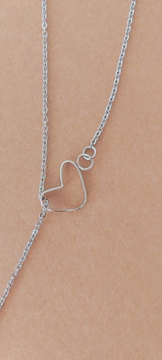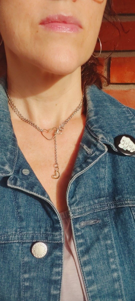 Collar tipo lariat con 2 corazones hechos a mano y cadena larga finita.