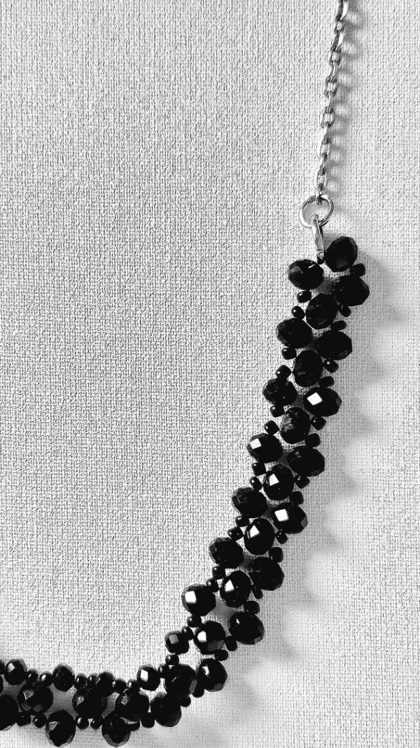 Tiene cuentas de dos tamaños distintos. Las cuentas de cristal son facetadas, puro brillo. El diseño es muy sofisticado y simple.