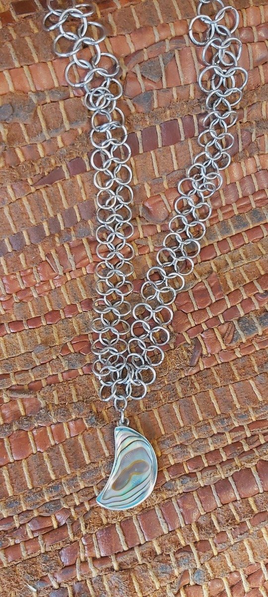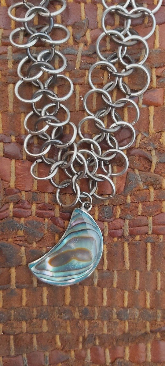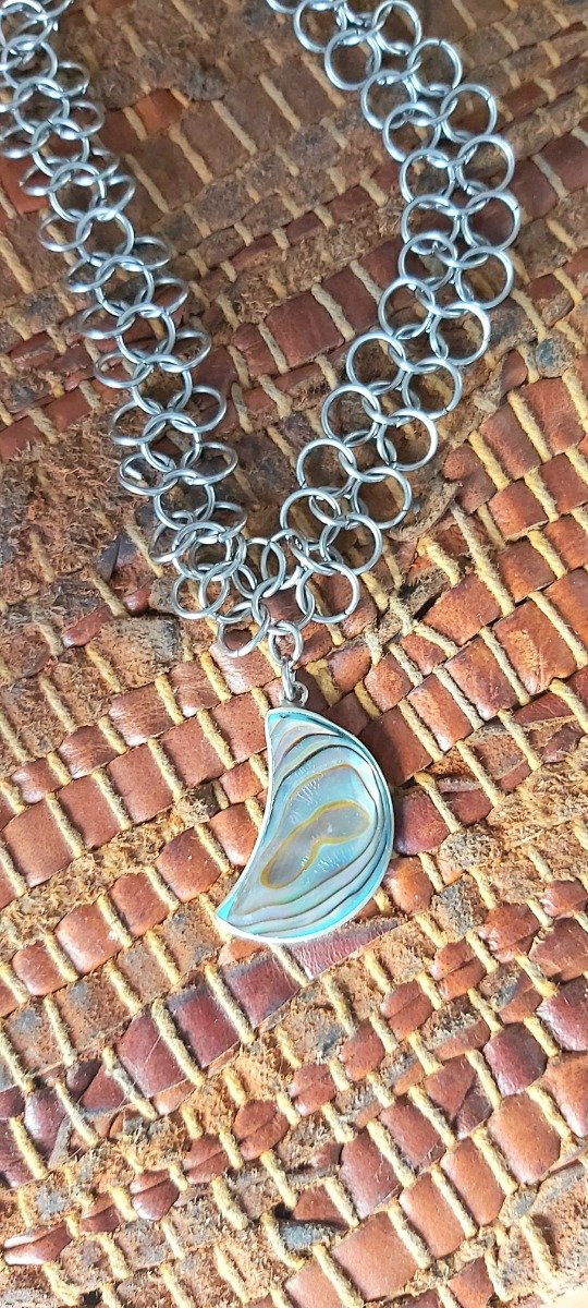El dije es una medialuna de haliotis natural con tonos de verdes que cambian con el movimiento.