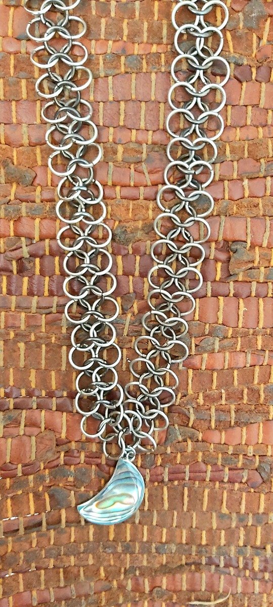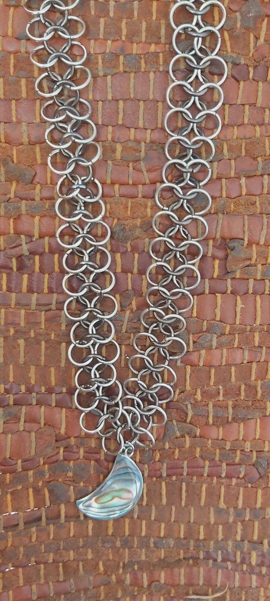 El material del collar es acero quirúrgico. Esta hecho a mano en forma artesanal con pequeñas argolitas de acero quirúrgico.