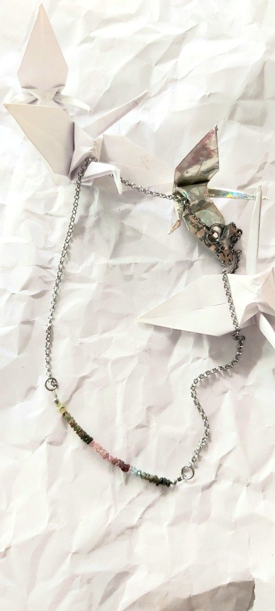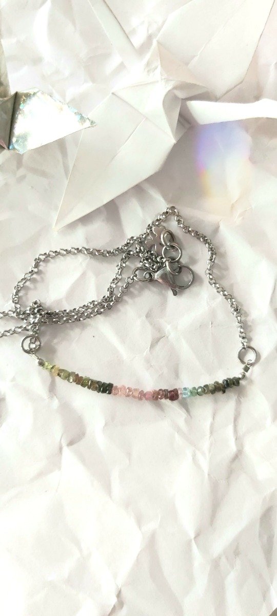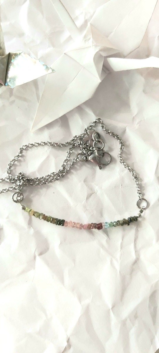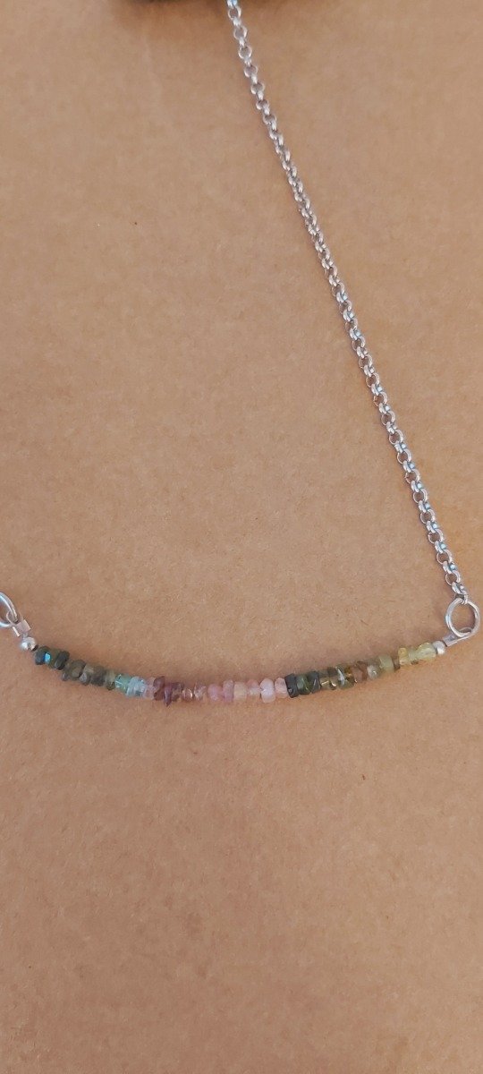 Collar con pequeñas turmalinas naturales de colores. Los tonos van del negro al rosa claro , pasando por el naranja, amarillo y verde. Cadena y cierre mosqueton de acero. Es regulable. Medida maxima 45cm. Terminacion con dije de trebol de 4 hojas, asi además de adornarte te trae buena suerte.