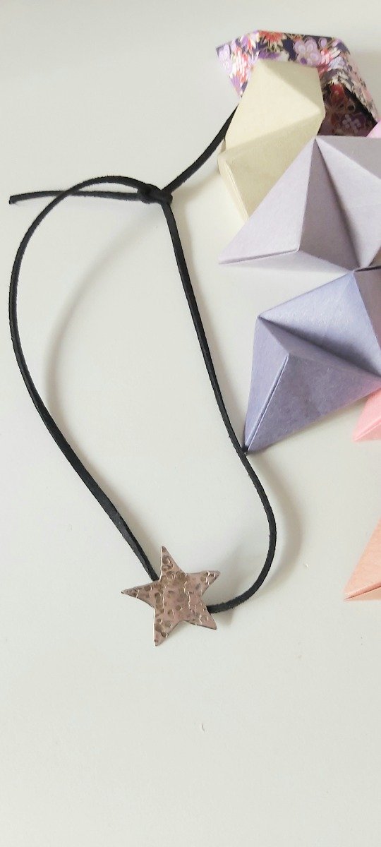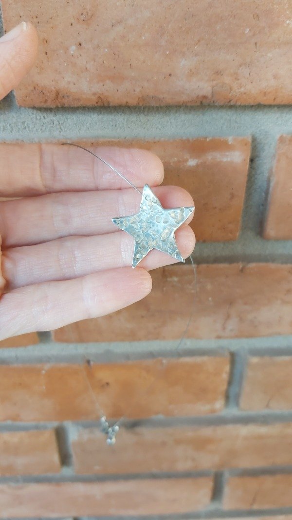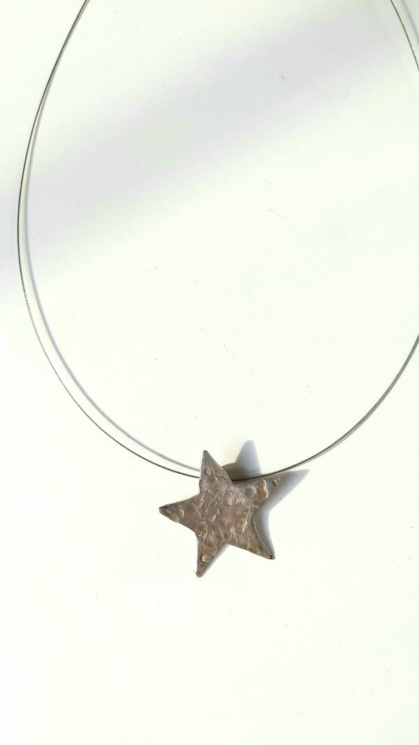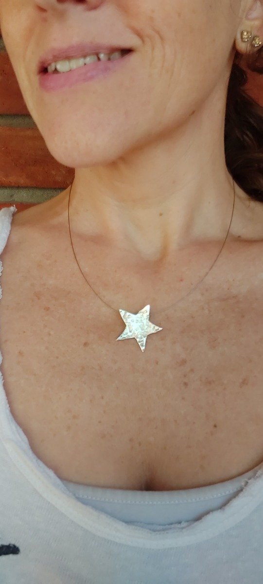 Pieza confeccionada a mano con plata 925. El collar es tanza de acero, parece que la estrella flota!