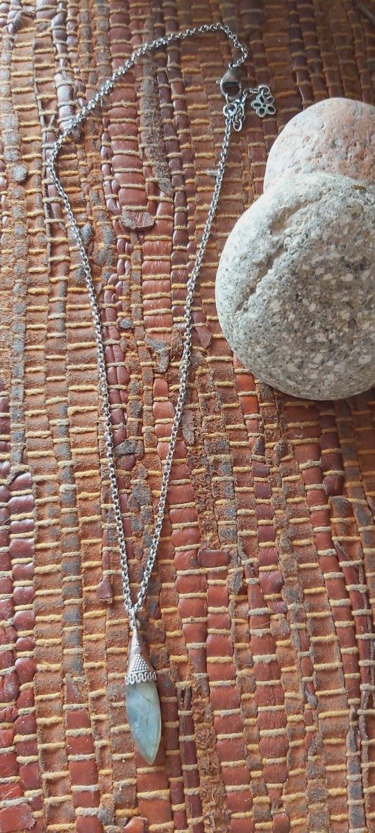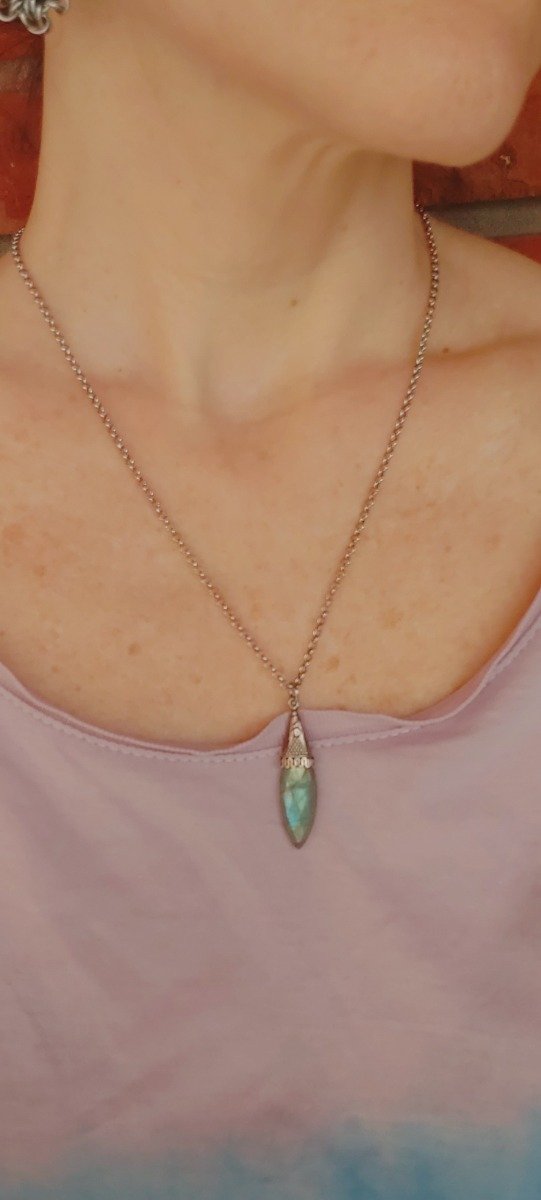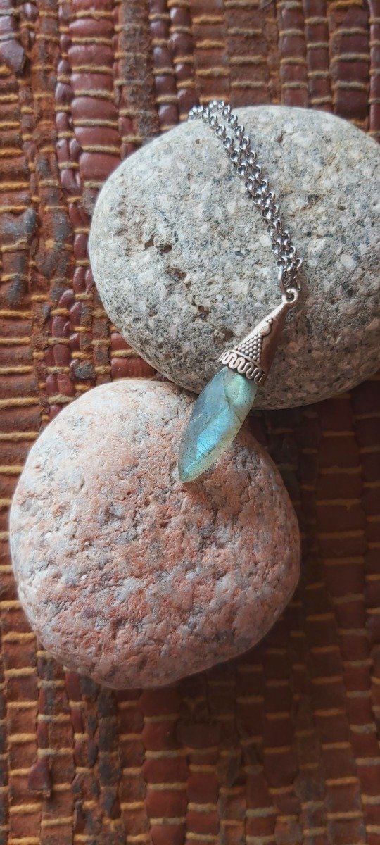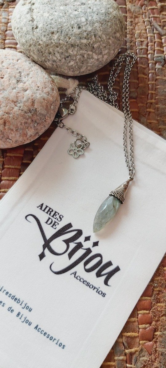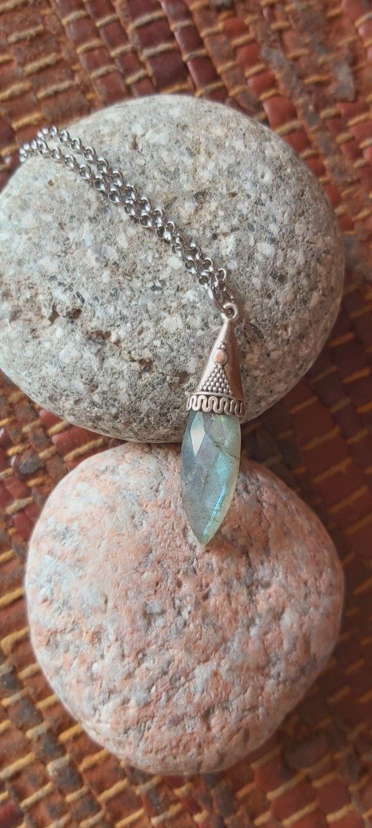 Labradorita de tonos verdes. Esta facetada para destacar su brillo natural.