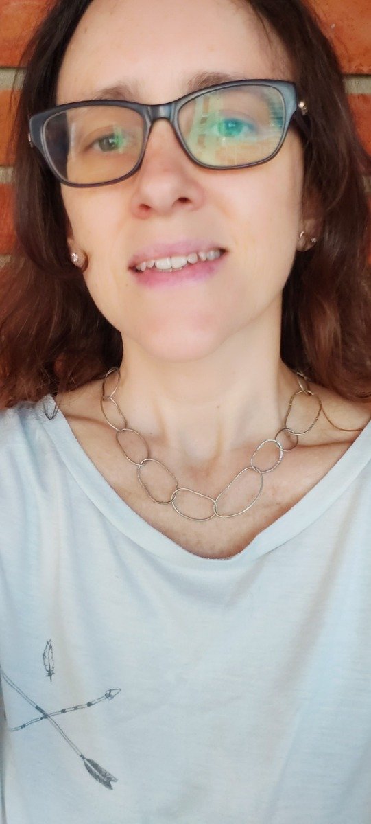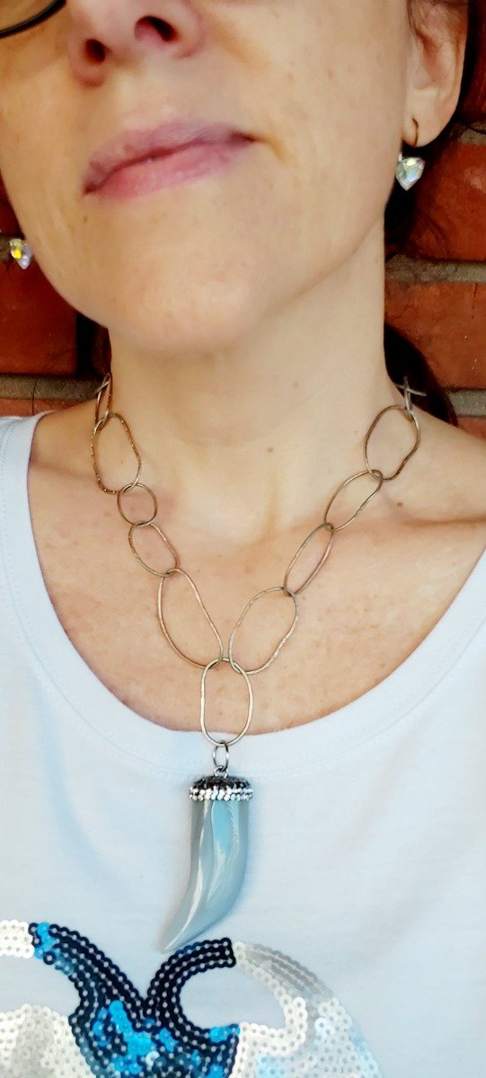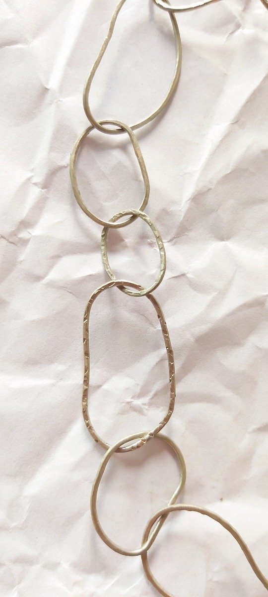Los eslabones están texturizados en ambos lados con distintas texturas. Mide 47 cm. Se puede hacer mas corto o mas largo a pedido y tambien en plata o bronce.
