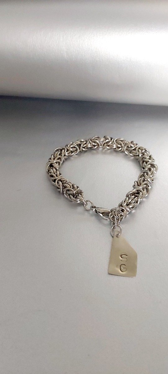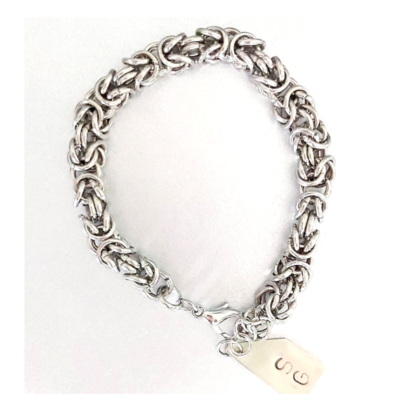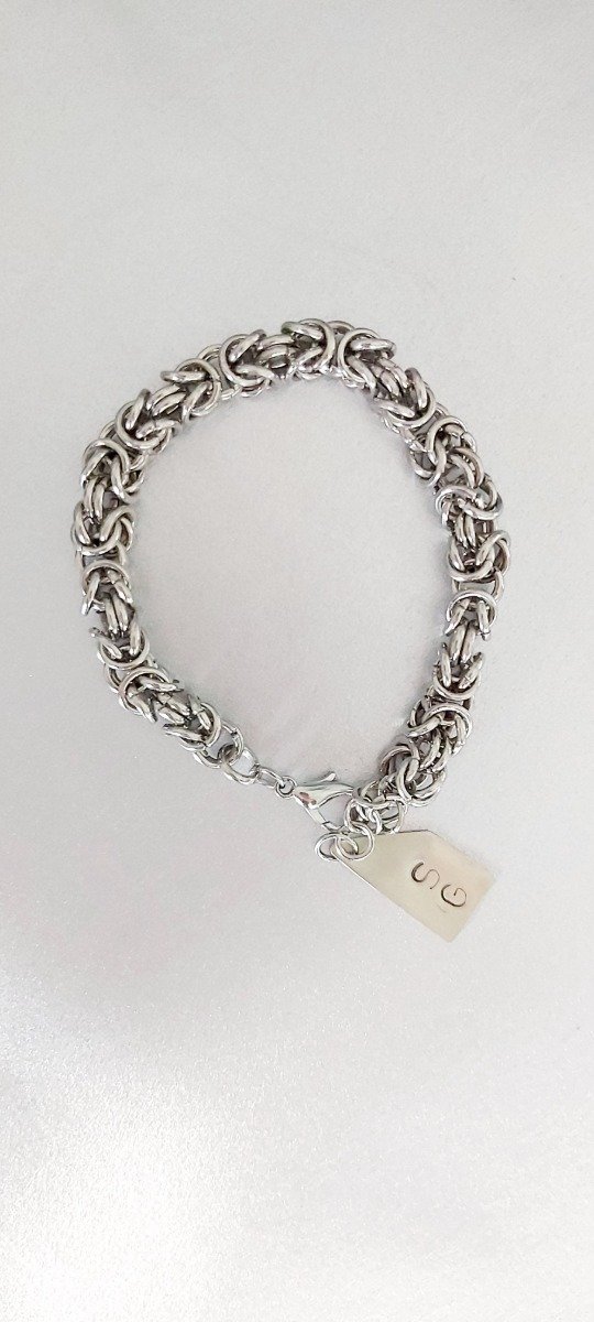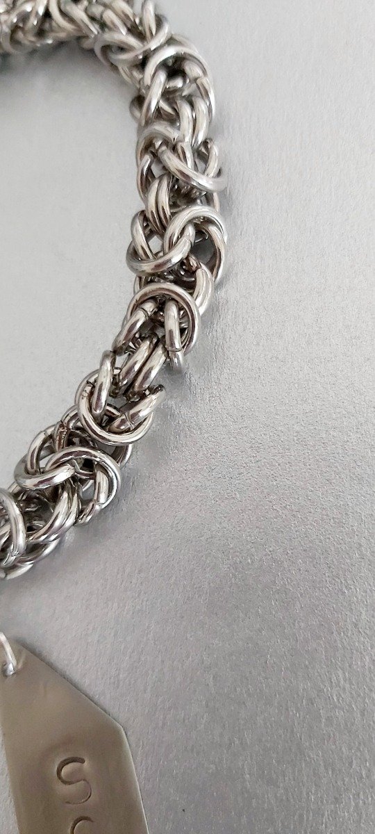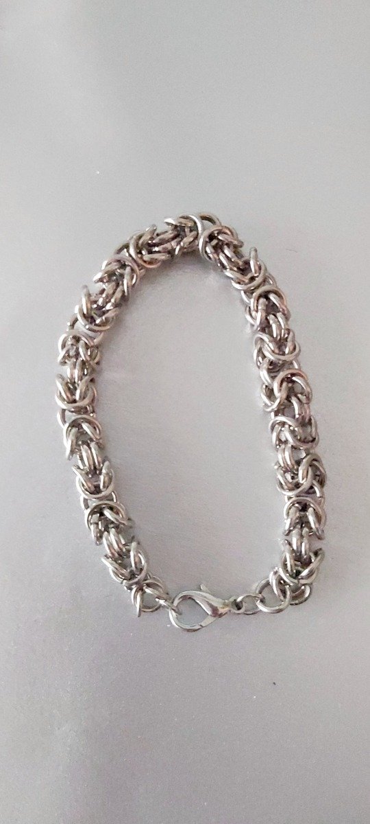 El material es metal color plata. Esta hecha a mano con tecnica de tejido medieval que consiste en entrelazar argollitas de metal.